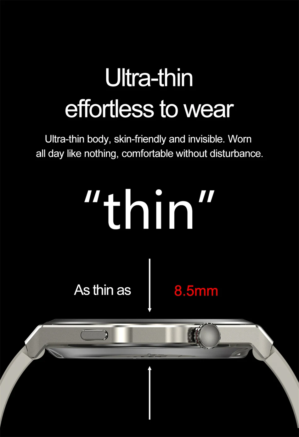 When ultra-thin technological aesthetics meets classic mechanical craftsmanship, this smart watch redefines wrist style. The 8.5mm slim body is only about 2 coins thick, and the extremely light weight of 30 grams makes it a seamless companion when wearing - it will not compress the wrist when sleeping, and will not get stuck in the sleeves when wearing a shirt or riding a bike. Say goodbye to the trouble of "wearing a watch is a burden".